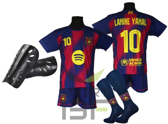 Strój piłkarski dla dzieci LAMINE YAMAL + getry + ochraniacze - rozmiar 122